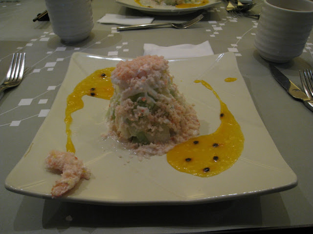 最上面是一隻蝦子,然後下面則是大量的水果(以哈密瓜為主,其餘忘了),灑上一些類似蝦鬆的粉~~然後淋上沙拉醬,最後再兩旁擺上百香果醬~~味道還不錯